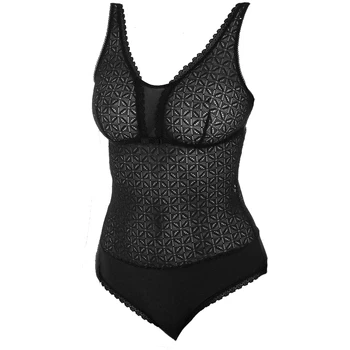 Lace bodysuit. Color Black Thin, elastic and adjustable straps. V-neckline with semitransparent lace detail. Bottom clasp closure, three positions. Comfortable and breathable fabric. Soft and elastic fabric, does not leave a mark. Inner lining, at the bottom. Matching visible seams. Composition: 85% Polyamide. - 15% Elastane. Care: - Wash at a temperature max.30º. - Do not use bleach. - Do not use dryer. - Do not iron. - Do not dry clean. Composition: 85% Polyimide, 15% Elastane Care: Wash at max temperature 40º. - Do not use bleach. - Do not use dryer. - Do not iron. - Do not dry clean.