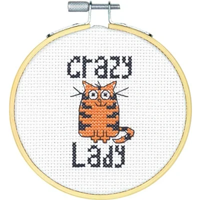 Includes presorted cotton cross stitch thread, 14 count white aida, 4Wood embroidery hoop, stitching needle, and instructions This quirky and funny cross stitch pattern is perfect for beginners and cat lovers alike Whether you are a crazy cat lady or merely aspire to be one, this cute cat cross stitch pattern is sure to make you smile When you're finished, give this cross stitch as a gift for cat lovers or put it on display in your home or office This beginner's cross stitch kit includes a wooden embroidery hoop for stitching and hanging your cross stitch creation