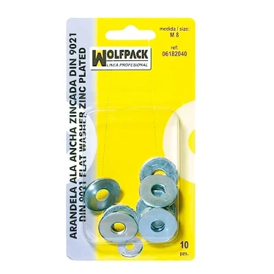Wide wing. Measurement: M08. Being zinc plated it is very resistant to corrosion. Blister of 10 pieces.