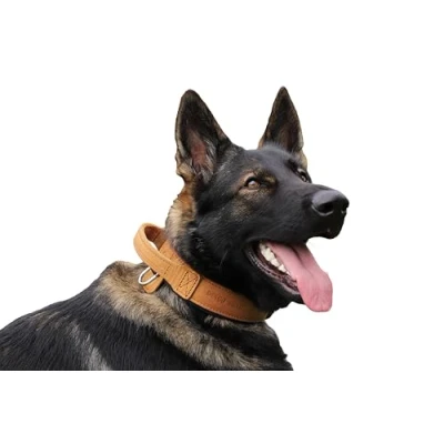 The leather dog collar features a solid handle for holding, lifting, and stopping. The training collar is padded with soft material, making it comfortable for the dog to wear. The fittings are chromed The Drago collar is suitable for dogs with a neck girth between 40 and 48 cm. Measure the dog's neck (neck circumference) and add a 2 cm gap for comfort Dog collars are approximately 5 cm wide and 1 cm thick. The length depends on the size, but please keep in mind that this is a handmade product, so some dimensions might slightly vary from the given ones The collar can be used as a regular collar and as a training collar. Its solid construction is helpful for strong, muscular breeds, assisting in teaching them to walk and cooperate with humans Durable collars, training leads, bite tugs, and other dog training equipment are crafted by hand in Poland by Dingo Gear – an original brand since 1977