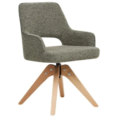 AmazonMinimalistic style dining chair that will suit in any modern home Crafted with oak legs and boucle fabric upholstery Swivel base turns smoothly adding funcionality Comfortably curved backrest and armrests Requires assembly