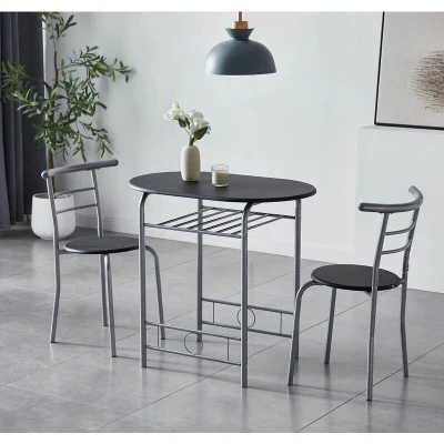 General description This 3 piece dining set features an elegantly curved design that will enhance the beauty of your kitchen or dining room. The black steel slat frame offers a stylish restaurant-style appearance, while the wood-like grains contribute to the unique look and feel of this set. The chairs are designed to fit neatly under the table when not in use, thanks to their curved backs that follow the shape of the table. Technical specifications Table dimensions: 80(L) x 53(W) x 76(H) cm Chair dimensions: 37(L) x 37(W) x 76(H) cm Material: Thick steel tubes and CARB P2-compliant MDF boards Usage Includes 2 chairs with mid-height backrests and round wooden seats Curved slat backrest provides strong body support Under-table shelf/rack for additional storage of wine bottles, napkins, and other essentials Option to remove the shelf for larger leg room