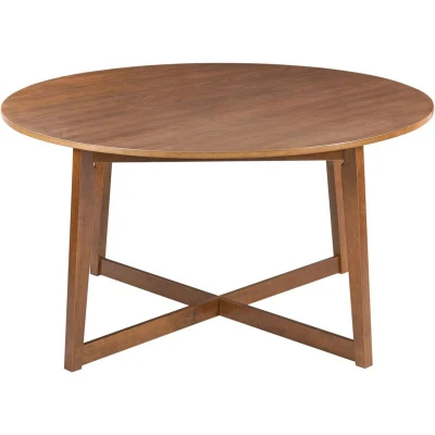 General description This round dining table brings a natural warmth to your space. Its smooth wood veneer top is spacious, and the sturdy legs, crafted from durable rubberwood, are set at an elegant angle with a cross detail for extra stability and style. Perfect for everyday meals or relaxed gatherings, it combines practicality with a timeless design that seamlessly integrates into any home. Technical specifications Product Type: Round Table Style: Retro General Color: Brown Main Material: MDF Additional Material: Rubberwood Legs Material: Wood Top Material: Wood Shape: Round Finish: Oak Wood Veneer Seats Up To: 4 - 6 People Dimensions: Width: 140 cm, Length: 140 cm, Height: 75 cm Weight: 35 kg Weight Capacity: 50 kg Installation Full Assembly Required Estimated Assembly Time: 20-40 min Usage To maintain the durability and aesthetics of the worktop, it is recommended to use place mats and coasters. Remove wet stains as soon as possible to prevent damage to the product. Maintenance
