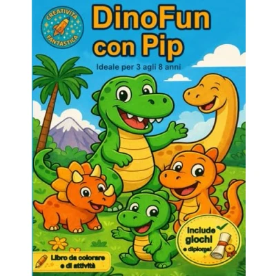 DinoFun con Pip: Libro da Colorare per Bambini dai 3 agli 8 Anni Simpatici Dinosauri, Attività Divertenti e il Tenero Pip