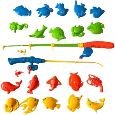 INTERACTIVE FISHING EXPERIENCE: The Magnetic Fishing Game Toy Set includes 20 colourful fish pieces and a fishing rod, offering an engaging, hands-on experience for children. Designed to mimic real fishing, the magnetic fish easily attach to the rod, making it a fun and rewarding activity that helps improve hand-eye coordination and fine motor skills. The interactive nature of the game encourages active participation, keeping kids entertained for hours. INDOOR AND OUTDOOR PLAY: This versatile play set is perfect for both indoor and outdoor environments, providing endless entertainment regardless of the weather. The lightweight design makes it easy to set up the game in a playroom, backyard, or even at the beach, making it a great choice for family gatherings, parties, or everyday play. The set’s flexibility ensures children can enjoy fishing adventures anywhere, enhancing their creative play experiences. VIBRANT COLOURS FOR VISUAL APPEAL: Each fish in the set is brightly coloured, and designed to capture the attention of young children and stimulate their visual senses. The vibrant hues make the fish easy to spot, adding an extra layer of excitement to the game as kids eagerly try to "catch" their favourite fish. This colourful assortment not only enhances the fun factor but also aids in teaching colour recognition and sorting skills. DURABLE CONSTRUCTION FOR LONG-LASTING FUN: Made from good-quality materials, this fishing game set is built to withstand easy and fun play. The robust construction ensures that both the fishing rod and fish pieces are durable, maintaining their shape and magnetic functionality even after repeated use. The sturdy design guarantees a safe play experience, giving parents peace of mind while children enjoy their fishing game. LIGHTWEIGHT AND PORTABLE DESIGN: The Magnetic Fishing Game Toy Set is designed to be lightweight and compact, making it easy to store and transport. The entire set can be conveniently packed away, allowing kids to bring the fun wherever they go, whether it's a family vacation, a playdate, or a trip to the park. The portability of the set encourages social play and sharing among friends, enhancing cooperative skills and making it a versatile addition to any child’s toy collection.