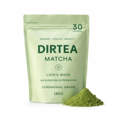 DIRTEA 100% Organic Matcha Tea with Lion’s Mane & Tremella Ceremonial Grade from Japan 2,500mg Mushrooms per Serving Vegan Non GMO 180g 30 Servings