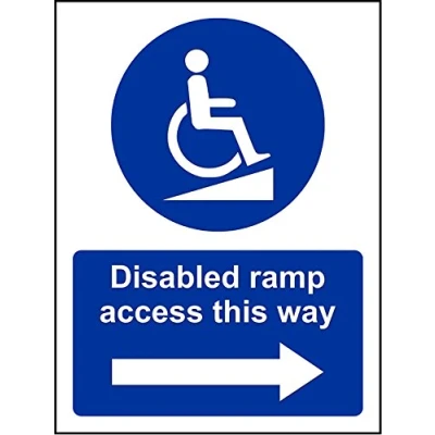 Disabled ramp access this way right safety sign 3mm Aluminium sign 300mm x 200mm Digitally printed and laminated for extra durability 10mm Radius rounded corners so sharp edges, Manufacturer: KPCM Display