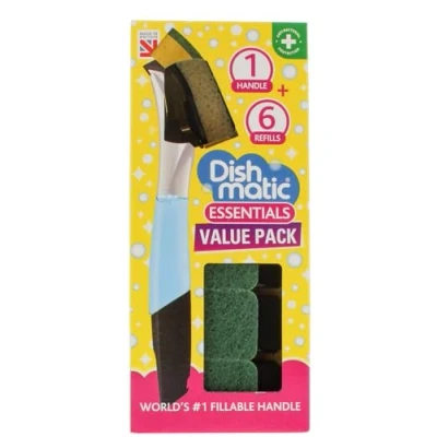 Dishmatic Value Pack Kit 1x Refillable Washing Up Liquid Dispensing Handle with 6X Replaceable General Purpose Sponge Heads Antibacterial Kitchen Easy Grip