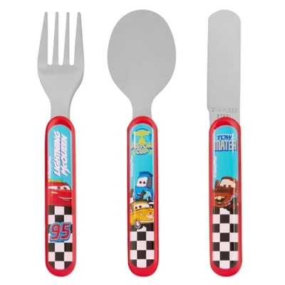 OFFICIAL DISNEY PIXAR CARS SET: 3-piece children's cutlery set featuring Lightning McQueen, Tow Mater, and other beloved Cars characters with racing checkered flag design COMPLETE DINING SET: Includes one stainless steel knife, one fork, and one spoon, providing everything your child needs for independent mealtime success DURABLE CONSTRUCTION: Made from high-quality stainless steel utensils with sturdy ABC plastic handles, designed to withstand daily use whilst remaining lightweight and easy for small hands to grip CHILD-FRIENDLY DESIGN: Ergonomically designed handles with Anna, Elsa and Olaf graphics make mealtimes fun and encourage independent eating EASY CARE INSTRUCTIONS: Hand wash in warm soapy water and air dry before first use and after each meal; not suitable for dishwasher, microwave, or steam steriliser, Weight: 0.3086471668 pounds, Manufacturer: DNC UK Ltd