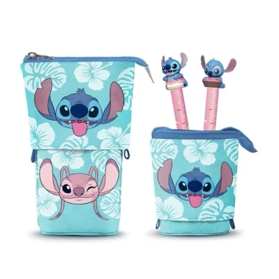 Disney Lilo and Stitch Aloha Cute Pencil Case + 2 Erasable Gel Pens, Blue, 11.5 x 17 cm