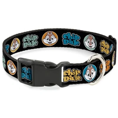 Disney Pet Collar, Dog Collar Plastic Buckle, Chip and Dale Expression Bubbles Black Multi Color, 16 to 23 Inches 1.5 Inch Wide