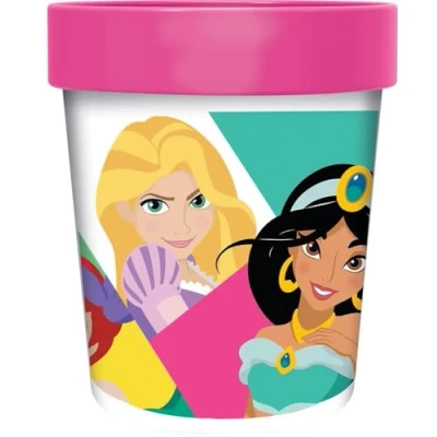 260 ml plastic cup with a non-slip base, adhering to any smooth surface, making it easier for children to use. Dimensions: height 9.5 cm, diameter 7.4 cm, and weight 32 g. The designs are dedicated to Disney princesses: Ariel, Rapunzel, Jasmine, Snow White, Belle, and Cinderella. Additionally, the cup is microwave safe (600 W max. - 2 min max.). Features: – Capacity: 260 ml, suitable for children from 4 years – Material: recyclable food-grade plastic (BPA-free), not dishwasher safe and not suitable for ovens – Cup with non-slip base – Height: 9.5 cm, Diameter: 7.4 cm, Weight: 32 g – Easy to clean, with princess graphics, officially licensed by Disney. Attributes: - character: Princesses. Categories: CHILD CARE > Beverages > Glasses