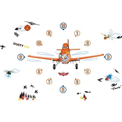 A Disney Planes wall clock that is battery operated and sticks to the wall A collection of 50 Disney Planes vinyl stickers that create a cool sky race scene on his wall Vinyl stickers include routine cues that can be placed at specific places around the clock High quality, specialist vinyl material is long lasting and straight forward to remove if required Minimum Space required: H 25cm x W 72cm - 1 x AA battery included