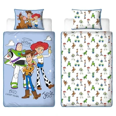 OFFICIAL PRODUCT: Officially licensed Disney Toy Story bedding set, includes a duvet cover and pillowcase with blue piping trim along the seams REVERSIBLE: The front side features Woody, Buzz Lightyear and Jesse on a blue background, while the reverse has a repeating pattern of Buzz, Woody, Jesse and the toy aliens on a white background, with a matching side to the pillowcase EASY CARE: The duvet cover is closed with poppers, so it’s easy to open and remove ready for the wash! The bedding is washing machine and tumble dryer safe at a low temperature RESPONSIBLY MADE: Made from a recycled polycotton mix (52% cotton 48% polyester) so this Toy Story bedding set is considerate to the environment MEASUREMENTS: Standard UK single bedding size, the Pixar Toy Story duvet cover measures 135 x 200cm, and the pillowcase measures 74 x 48cm