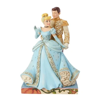 The Disney Traditions A Fairytale Love Cinderella and Prince Charming Figurine tells the tale of two lovers as they waltz the night away. Cinderella is flaunting her iconic blue dress, while prince charming is parading his classic uniform with gold detailing, On the base is a pumpkin and vine etched on the side, a quintessential detail of the Cinderella tale.The intricate etching and details included in this figurine not only add an extra level of dimension, but also make it unmistakably Jim Shore.Hand painted and hand carved.Comes in a branded gift box.Dimensions: 19.5 (H) x 14 (W) x 10 (D) cm.
