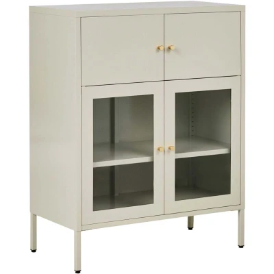 Glass Doors Cabinet. This versatile metal cabinet with a clean, contemporary design makes a perfect addition to a modern home. Its two upper doors conceal clutter, while the two lower glass doors provide an ideal space to display your favourite books and decor. The slim metal legs give it a lightweight feel, making it a perfect addition to any modern living or office space. Details: Product Type: Display Cabinet General Color: Beige Shade: Light Beige Material Type: Metal Main Material: Iron Additional Material: Glass Legs material: Metal Doors Opening: Standard Drawers: No Finish: Powder Coated Key Locked: No Number of Doors: 4 Shelves: Yes Dimensions: Depth: 40 cm Width: 80 cm Height: 102 cm Weight: 24 kg Shelf Weight Capacity: 20 kg Top Weight Capacity: 30 kg Offer Includes: 1 x Display Cabinet Key Features: Minimalistic, Scandinavian Style, Perfect for Both a Bedroom and a Living Room, Robust Frame, Plenty of Storage Space, Leg Caps for Surface Protection Assembly Information:
