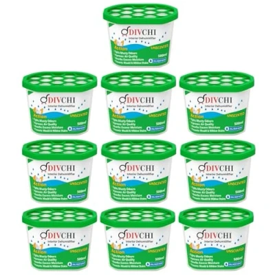 REDUCES DAMP & CONDENSATION - DIVCHI dehumidifier tub Effectively traps excess moisture in the air to prevent damp, condensation, and musty odours in your living spaces dehumidifiers for home HELPS PREVENT MOULD & MILDEW - DIVCHI dehumidifiers for home keep your home fresher and healthier by reducing the conditions where mould, mildew, and allergens thrive. NO POWER NEEDED – EASY TO USE - Simply place this dehumidifier in wardrobes, cars, or small rooms; the compact and portable design works without electricity or maintenance. LONG-LASTING 500ML CAPACITY - Each dehumidifier pot absorbs moisture for weeks, making it ideal for continuous use in bedrooms, kitchens, bathrooms, and cupboards. dehumidifiers for home, dehumidifier bags, humidifier for bedroom, dehumidifiers disposable, mould remover, moth repellent for wardrobes, dehumidifier for bedroom, damp absorber, condensation absorbers, bathroom dehumidifier, wardrobe dehumidifier hanging bags, dehumidifier hanging, wardrobe moisture absorber, damp trap, dehumidifier wardrobe, moisture trap, disposable dehumidifiers for home, dehumidifiers for home disposable, dehumidifier disposable, disposable dehumidifier, dehumidifier pack of 10, room dehumidifier disposable, dehumidifier tub