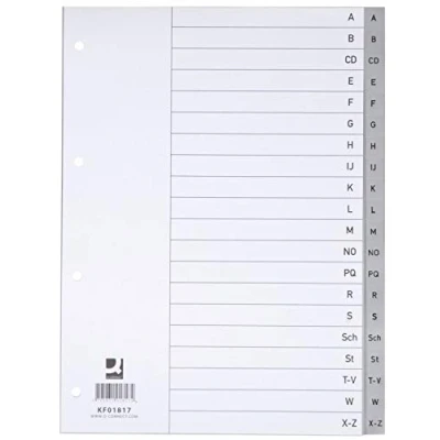 Dividers Q CONNECT PP A4 230x297mm a Z 20pcs Grey/Document Archiving/Type / Kind with Description Card/Index Historia/Material PP/Colour Grey/Format Thickness (mm) 120