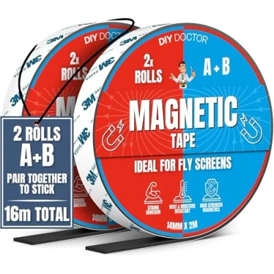 DIY Doctor A+B Magnetic Tape for Fly Screens 16 Metres of Strong Strips Self Adhesive Cut To Fit Sticky Strip 8m + A and B Polarity Thin Magnet