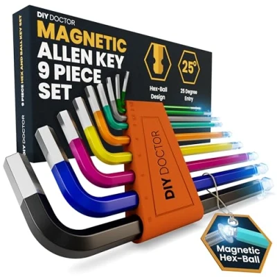 SECURE MAGNETIC BALL-END FOR TIGHT SPACES - Tackle hard-to-reach fixings confidently with our magnetic ball-end tip – offering firm grip and up to 25° angled access without slippage. COLOUR-CODED FOR FAST SIZE RECOGNITION - Never fumble for the right size again. Each allen key is brightly colour-coded for quick identification and efficient multitasking. EXTRA-LONG REACH WITH ADDED TORQUE - Long arm design delivers greater turning force and leverage, ideal for loosening tight bolts or achieving a more secure fix. BUILT TO LAST – INDUSTRIAL-GRADE CRV STEEL - Crafted from high-grade chrome vanadium steel, this hex key set resists wear, flexing and rounding – made to withstand heavy use. VERSATILE TOOLKIT FOR HOME, BIKE & BEYOND - From flatpack furniture and bike repairs to valves, toys and appliances – this allen key set covers all common metric sizes from 1.5mm to 10mm, Manufacturer: DIY Doctor