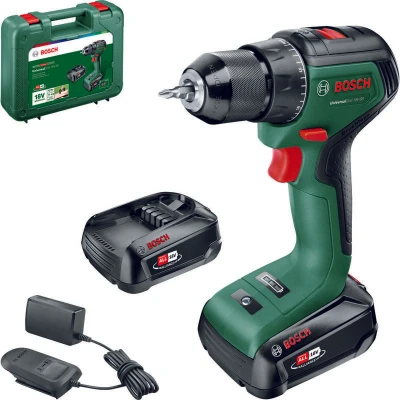 General description The BOSCH DIY UniversalDrill 18V-60 is a versatile and powerful drill driver designed for various DIY projects. It features a 13mm keyless chuck for easy bit changes and comes with two 2.0Ah Li-ion batteries and a charger, ensuring you have the power you need for extended use. With a maximum torque of 60Nm, this drill can handle a wide range of materials and tasks. Technical specifications Voltage: 18V Chuck size: 13mm Max torque: 60Nm Batteries: 2 x 2.0Ah Li-ion Speed settings: 2 speed / variable / reversing Other information Includes carry case for easy storage and transport