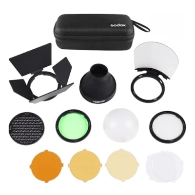 ✔Godox AK-R1 accessory kit for round flash head adopts magnetic accessory port,which supports to use more accessories simultaneously and achieve creative light effects with great convenience and portability ✔Godox AK-R1 accessory kit compatible with Godox V1 series speedlight Godox H200R Round Flash Head to install AD200Pro AD200 Pocket Flash ✔AK-R1 accessory kit includes Dome Diffuser, Diffuser Plate, Four-wing Reflector, Bounce Card, Honey Comb, Color Filters, Snoot, Portable Bag ✔Magnetic Accessory Port to achieve simple and fast installaion ✔Optional magnetic accessories attach quickly and can be stacked on top of each other as needed