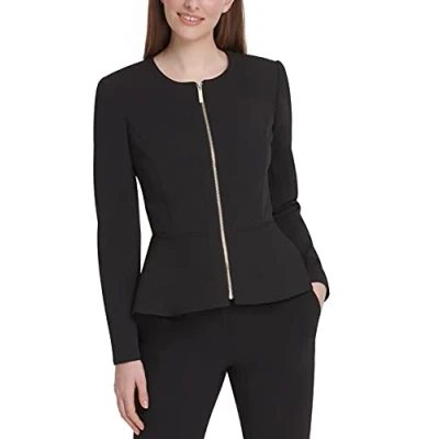 Collarless crew neckline Zip front closure Peplum hemline
