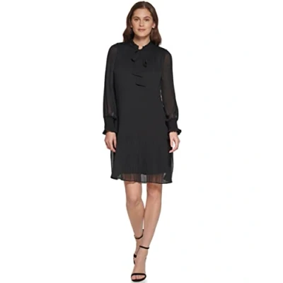DKNY Women's Long Sleeve Tie Neck Pleated Shift Dress, Black, 16