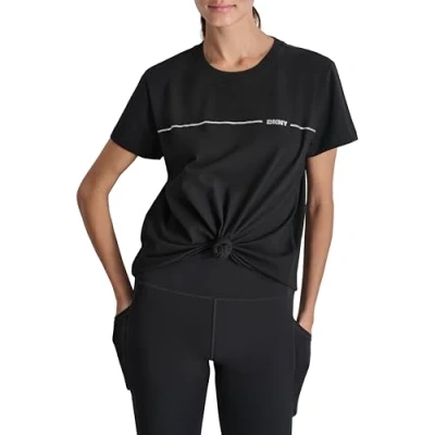 Introducing the "Rhinestone Stripe Logo Top" by DKNY, where sporty meets chic in every stitch; crafted from 100% cotton, this knotted top is designed for those who crave both comfort and style in equal measure Perfectly balancing athletic inspiration with a youthful edge, the Rhinestone Stripe Logo Top embodies DKNY's iconic flair; its regular length ensures versatile wear, ideal for mixing and matching with your favorite bottoms—from high-waisted jeans to casual joggers Emblazoned with DKNY's signature rhinestone stripe logo, this top adds a touch of sparkle to your ensemble, effortlessly elevating your look whether you're hitting the gym or catching up with friends; the short sleeves offer unrestricted movement, making it an ideal choice for active days filled with adventure For those who value comfort without compromising on style, the Rhinestone Stripe Logo Top by DKNY is your go-to essential; embrace the energy of urban living with a piece that celebrates dynamic lifestyles and youthful spirit, ensuring you stand out with every wear