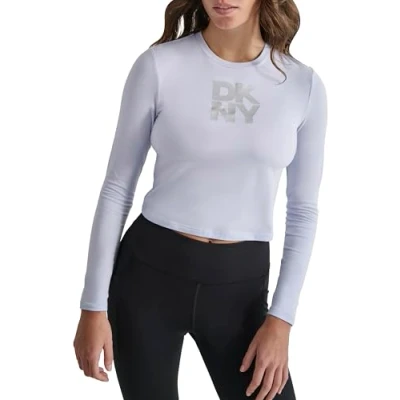 DKNY, Women's Stacked Textured STTRIPE Logo Long Sleeve Tee, Rain/Silver, M, M