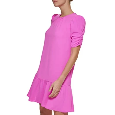 DKNY Women's Trapeze Dress with Ruched Sleeves and Ruffle Hem, Cosmic Pink, 6