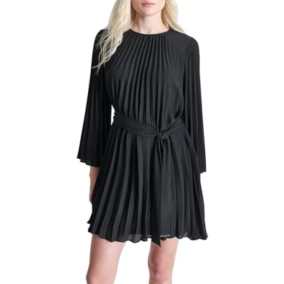 The DKNY long sleeve pleated A-line dress in black is a perfect blend of elegance and versatility. With its flattering A-line silhouette, this dress cinches at the waist and gently flares out, creating a beautiful shape that suits a variety of body types. Made from high-quality polyester, it offers a comfortable fit without sacrificing style, making it ideal for both professional and social settings. Featuring a classic crew neck and a stylish button closure, this dress is easy to slip on and off while providing a sophisticated look. The long sleeves add an element of warmth, making it a fantastic choice for cooler weather. Whether you're attending a business meeting, a dinner party, or a wedding, this dress adapts effortlessly to any occasion. he mid-thigh length is both chic and practical, allowing for easy movement while keeping you stylishly covered. Pair it with tailored heels for a polished office look or dress it down with ankle boots for a more casual outing. The dress's understated design offers a perfect backdrop for your favorite accessories, allowing you to express your unique style. Invest in this DKNY pleated A-line dress and experience the ease of dressing up without the foot. Its timeless design and versatile nature ensure that it will remain a staple in your wardrobe for years to come. Celebrate your individuality and sophistication with this exquisite piece that effortlessly enhances your fashion collection.