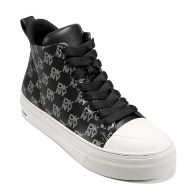 DKNY Women's Yaser Logo Lace Up Mid Sneaker, Black and Nickel, 4.5 UK