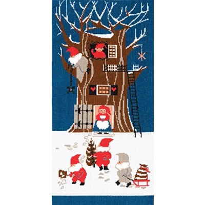 A counted cross stitch from DMC entitled Tomte Tree House by Jerry Roupe. The kit contains the cross stitch instruction chart, 14 count aida fabric, the DMC stranded cottons to complete the design, and a needle.