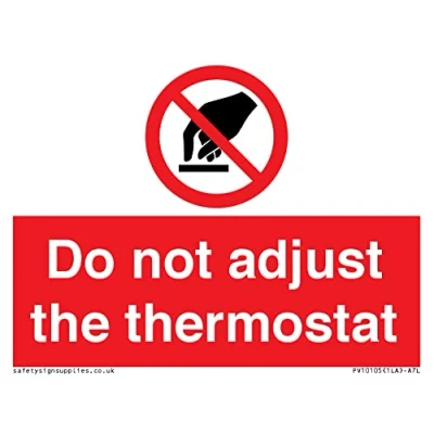 P010 : Do not touch This sign is made from plastic rigid 3mm 3mm plastic sign with foam core. Can be screwed, stuck with adhesive or hung with a hanging kit. Not suitable for cable ties. A7 landscape Sign Text: Do not adjust the thermostat