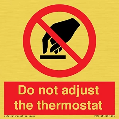 P010 : Do not touch This sign is made from plastic semi-rigid gold S85 square Sign Text: Do not adjust the thermostat
