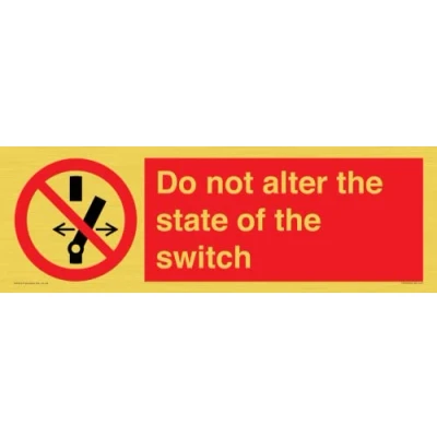 P031 : Do not alter the state of the switch This sign is made from vinyl gold sticker Gold metal effect sticker for flat, clean surfaces. Not for rough, plastic, or dusty surfaces. 41 landscape Sign Text: Do not alter the state of the switch