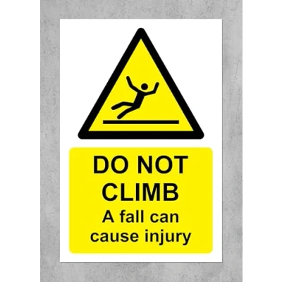 Do not climb a fall can cause injury Safety sign 1mm Plastic sign Digitally printed for extra durability Drill and screw in position or use double sided tape to mount onto suitable surface.