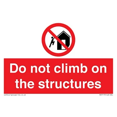 P502 : Do not climb on structures This sign is made from vinyl / sticker Air Release vinyl makes it easy to stick to flat, clean surfaces without bubbles. Not for rough, plastic or dusty surfaces. A6 landscape Sign Text: Do not climb on the structures