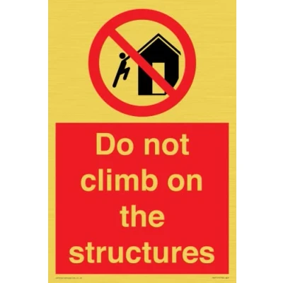 P502 : Do not climb on structures This sign is made from vinyl gold sticker Gold metal effect sticker for flat, clean surfaces. Not for rough, plastic, or dusty surfaces. A4 portrait Sign Text: Do not climb on the structures