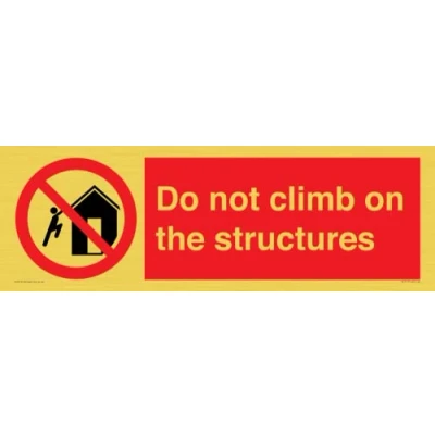 P502 : Do not climb on structures This sign is made from vinyl gold sticker Gold metal effect sticker for flat, clean surfaces. Not for rough, plastic, or dusty surfaces. 62 landscape Sign Text: Do not climb on the structures