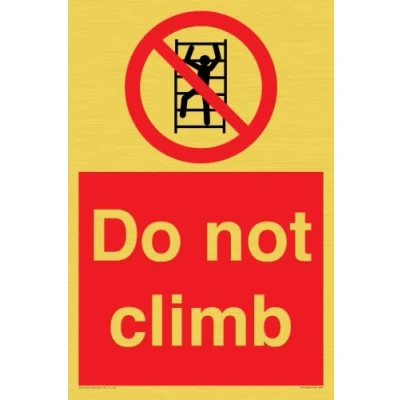P009 : No climbing This sign is made from vinyl gold sticker Gold metal effect sticker for flat, clean surfaces. Not for rough, plastic, or dusty surfaces. A4 portrait Sign Text: Do not climb