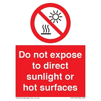 P068 : Do not expose to direct sunlight or hot surface This sign is made from vinyl / sticker Air Release vinyl makes it easy to stick to flat, clean surfaces without bubbles. Not for rough, plastic or dusty surfaces. A7 portrait Sign Text: Do not expose to direct sunlight or hot surfaces