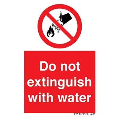 P011 : Do not extinguish with water This sign is made from vinyl / sticker Air Release vinyl makes it easy to stick to flat, clean surfaces without bubbles. Not for rough, plastic or dusty surfaces. A8 portrait Sign Text: Do not extinguish with water
