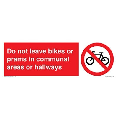 P913 : No cycling This sign is made from vinyl / sticker Air Release vinyl makes it easy to stick to flat, clean surfaces without bubbles. Not for rough, plastic or dusty surfaces. 31 Sign Text: Do not leave bikes or prams in communal areas or hallways.