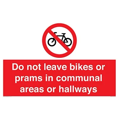 P913 : No cycling This sign is made from vinyl / sticker Air Release vinyl makes it easy to stick to flat, clean surfaces without bubbles. Not for rough, plastic or dusty surfaces. A2 landscape Sign Text: Do not leave bikes or prams in communal areas or hallways.