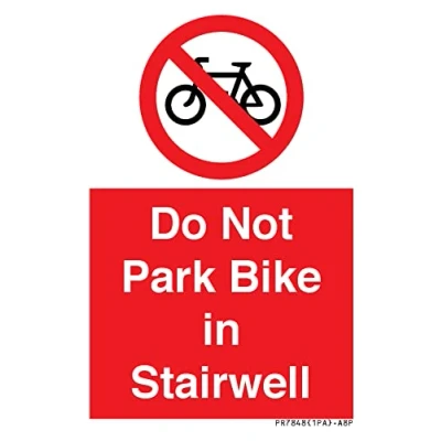 P913 : No cycling This sign is made from vinyl / sticker Air Release vinyl makes it easy to stick to flat, clean surfaces without bubbles. Not for rough, plastic or dusty surfaces. A8 portrait Sign Text: Do Not Park Bike in Stairwell
