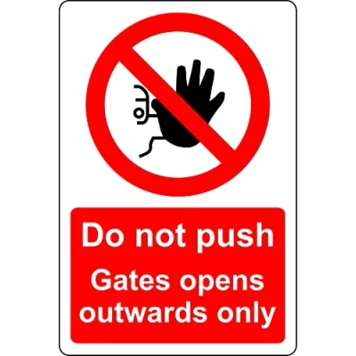 Do not push gate opens outwards only Safety sign 3mm Aluminium sign Digitally printed and laminated for extra durability 10mm Radius rounded corners, no sharp edges