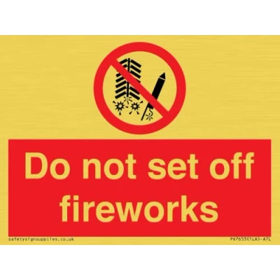 P040 : Do not set off fireworks This sign is made from vinyl gold sticker Gold metal effect sticker for flat, clean surfaces. Not for rough, plastic, or dusty surfaces. A7 landscape Sign Text: Do not set off fireworks