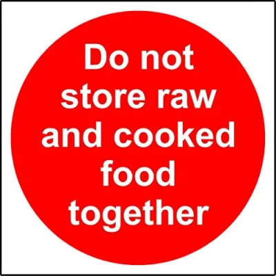 Do not store raw and cooked food together Kitchen catering safety sign Self adhesive sticker 100mm x 100mm Digitally printed and laminated for extra durability Remove backing film and apply to dry, smooth, oil free surface., Manufacturer: KPCM Display ltd